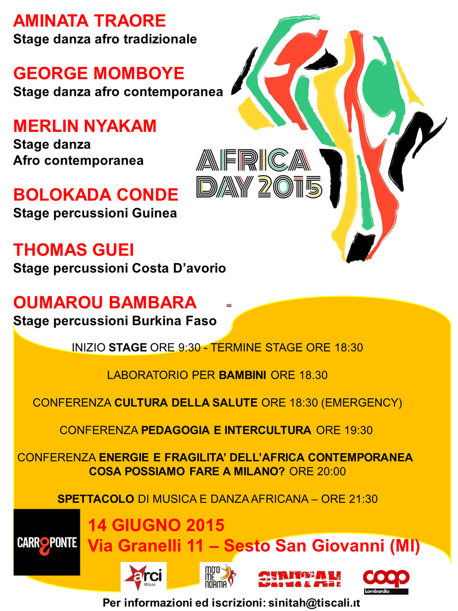 L’AFRICA DAY è la giornata dell’orgoglio africano, quindi vogliamo cogliere l’opportunità di incontrare non solo le radici della tradizione ma anche dare uno sguardo al domani. La giornata al circolo ARCI Carroponte inizierà sin dal mattino con varie iniziative, in particolare con gli stage di danza e musica che vedranno protagonisti star di fama mondiale e finirà con gli spettacoli serali.