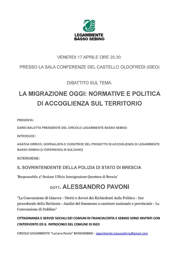 La migrazione oggi: normative e politica di accoglienza sul territorio è infatti il titolo del dibattito organizzato dal circolo Legambiente di Basso Sebino. Interverrà il dott. Alessandro Pavoni, sovrintendente della polizia di stato di Brescia, che farà luce su fondamentali tematiche, quali: la Convenzione di Ginevra, i diritti e i doveri dei richiedenti asilo politico, l’iter procedurale della richiesta, l’analisi del fenomeno a carattere nazionale e provinciale e la Convenzione di Dublino.