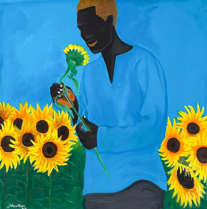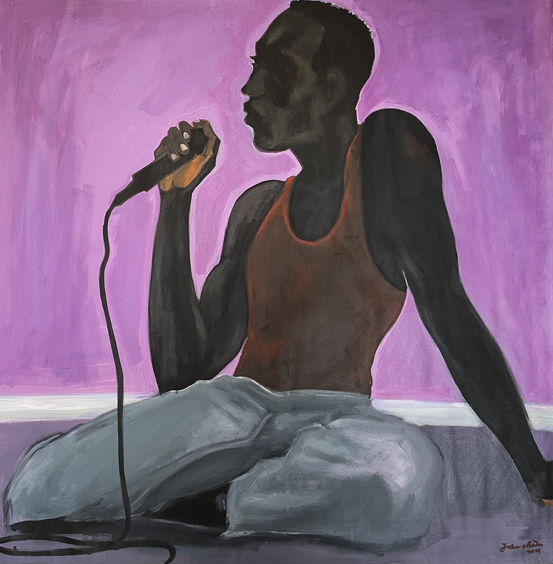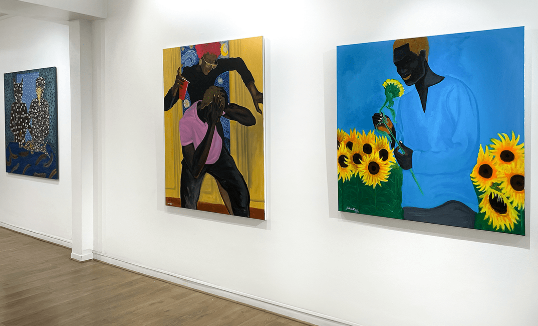 Attraverso i suoi dipinti eclettici, John Madu, (la foto di apertura si riferisce alle sue opere) classe 1983, ribalta i clichĆ© tradizionali del dominio e si addentra nella riflessione sull’identitĆ nell’epoca della globalizzazione. Opera una sorta di potenziamento dei suoi personaggi. Li libera dal canone precostituito e riscrive per loro un mondo in cui ciascuno può aspirare a essere chi desidera. Il suo universo visivo ĆØ segnato da numerosi riferimenti: cenni alla storia dell’arte, alla quotidianitĆ della gioventù nigeriana, alla cultura pop. Nei suoi quadri si sente sempre la presenza Vincent Van Gogh o di Gustav Klimt o di Keith Haring. Presenti in un particolare, nascosti dietro una porta, a volte intenti a permeare l’intero dipinto con la loro impronta.