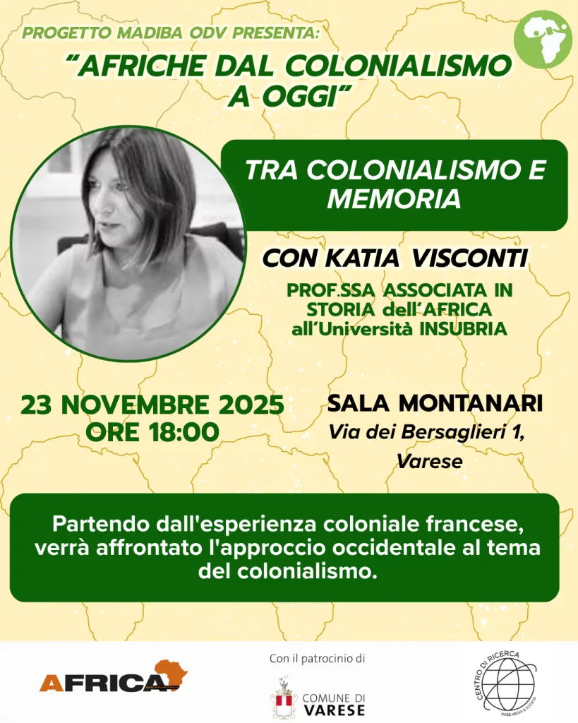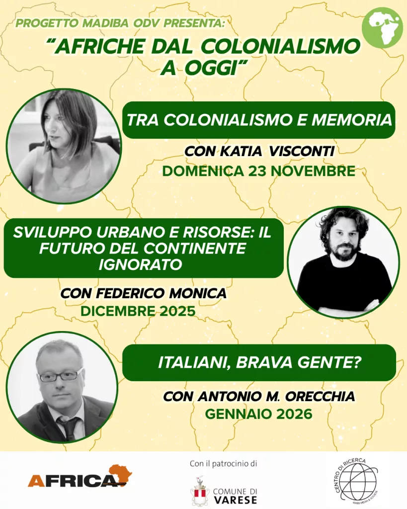 Domenica 23 novembre alle ore 18.00, presso Sala Montanari a Varese, si terrà il primo di tre incontri del ciclo “Afriche, dal colonialismo ad oggi”. Il percorso, organizzato dal Progetto Madiba in collaborazione con il Dipartimento di Storia dell’Università dell’Insubria, Rivista Africa e con il patrocinio del Comune di Varese, propone tre appuntamenti dedicati al tema del colonialismo, affrontato da prospettive diverse: memoria, risorse e storia d’Italia.