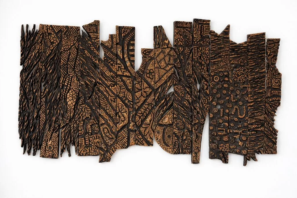La resistenza si manifesta anche attraverso la rivendicazione culturale: Frédéric Bruly Bouabré propone un alfabeto autonomo per sottrarsi alla dipendenza linguistica coloniale, mentre la spiritualità visionaria di Kwame Akoto eleva il conflitto a una battaglia cosmica tra bene e male. Il fuoco stesso si fa tecnica nelle opere di Gerald Chukwuma e Alex Peter Idoko, che lo utilizzano per incidere la memoria sul legno o sulla superficie pittorica, trasformando la distruzione in linguaggio. La mostra tocca poi la colonizzazione dei consumi con Kawote Ejioye, che riveste le divise militari con loghi del lusso, e l’iperrealismo di John Hopex, che interroga l’irrazionale seduzione del potere. Chiude idealmente il cerchio la ricerca di Owusu Ankomah, i cui simboli Adinkra cercano un’unità universale capace di superare ogni frammentazione.