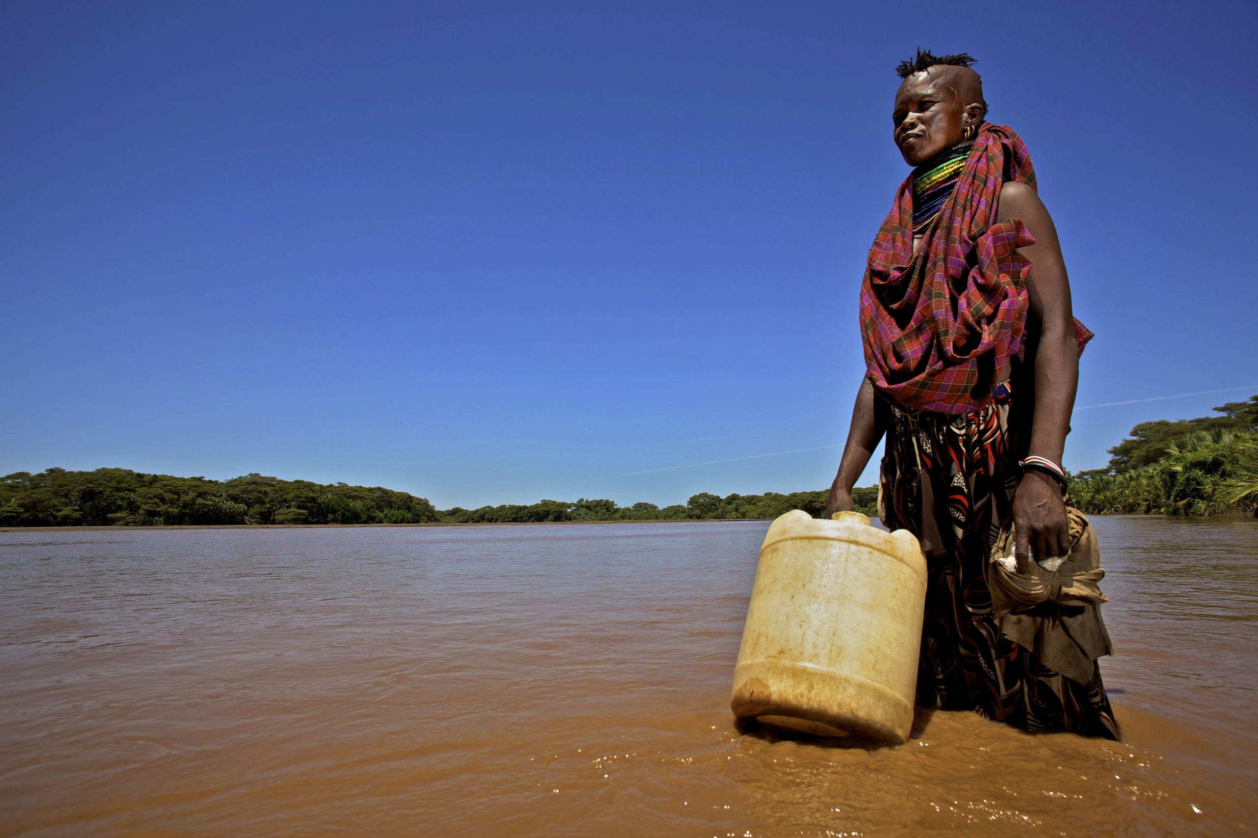 Una donna della tribù dei Turkana attraversa un fiume per andare a prendere l’acqua da un pozzo poco profondo vicino al villaggio di Kache Imeri. Foto di Panos Pictures