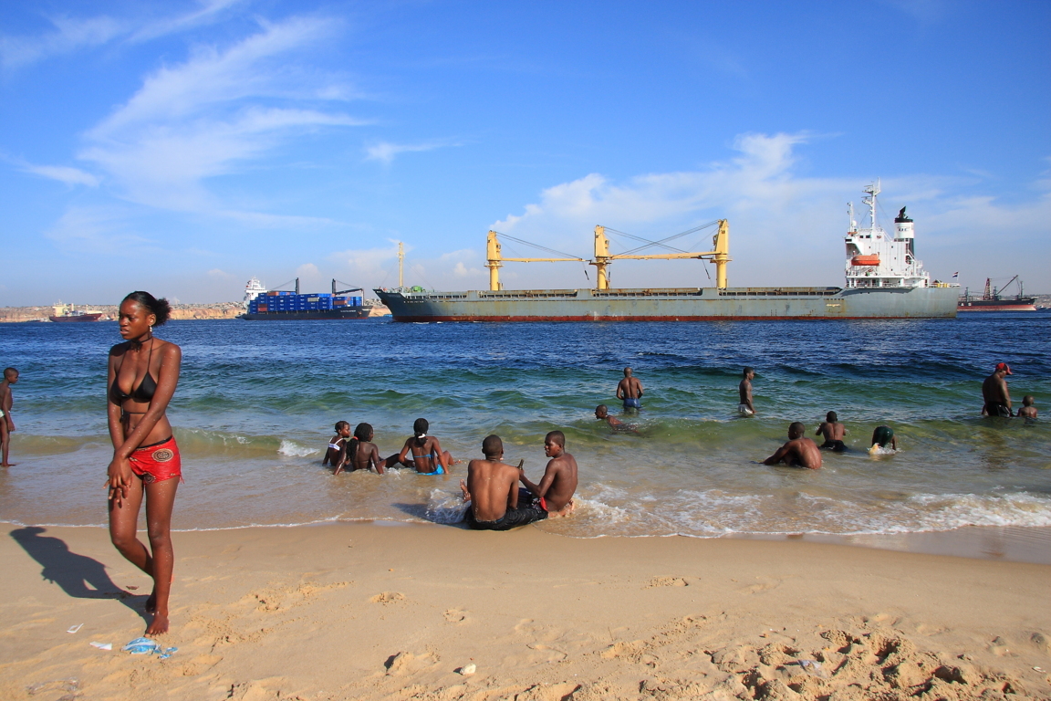 Bagni e relax nella baia di Luanda affollata da navi mercantili. Dopo dieci anni di boom economico l’Angola deve fare i conti con la crisi economica globale, innescata dalla pandemia di coronavirus e acuita dal crollo del prezzo del petrolio, di cui è il maggiore esportatore africano. – Foto di Marco Trovato