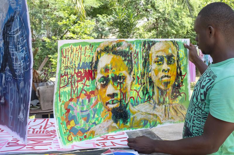 Thò Simoes, uno dei più importanti artisti dell’Angola, mostra una sua opera d’arte. – Foto di Giulio Paletta