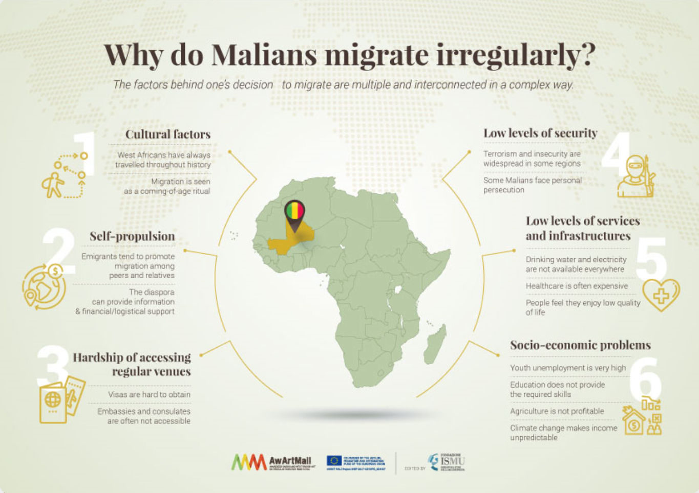 L’obiettivo di AwArtMali è cambiare la percezione e il comportamento dei maliani che considerano la migrazione irregolare verso l’UE come l’unica soluzione ai loro problemi socioeconomici sensibilizzando i maliani sui rischi delle migrazioni irregolari, nonché sulle vie di migrazione legale e le opportunità socioeconomiche disponibili nel loro paese. Con la nuova sezione tematica il progetto intende mettere dati rilevanti e affidabili a disposizione di diversi stakeholders e policymakers Europei e africani che lavorino nelle aree della migrazione e dello sviluppo sostenibile in Mali.