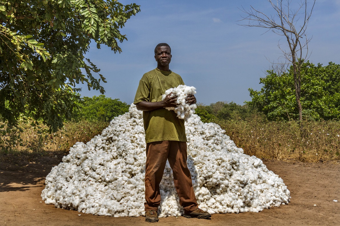 Benin, un agricoltore davanti a un cumulo di cotone grezzo. – Foto di Andrew Esiebo