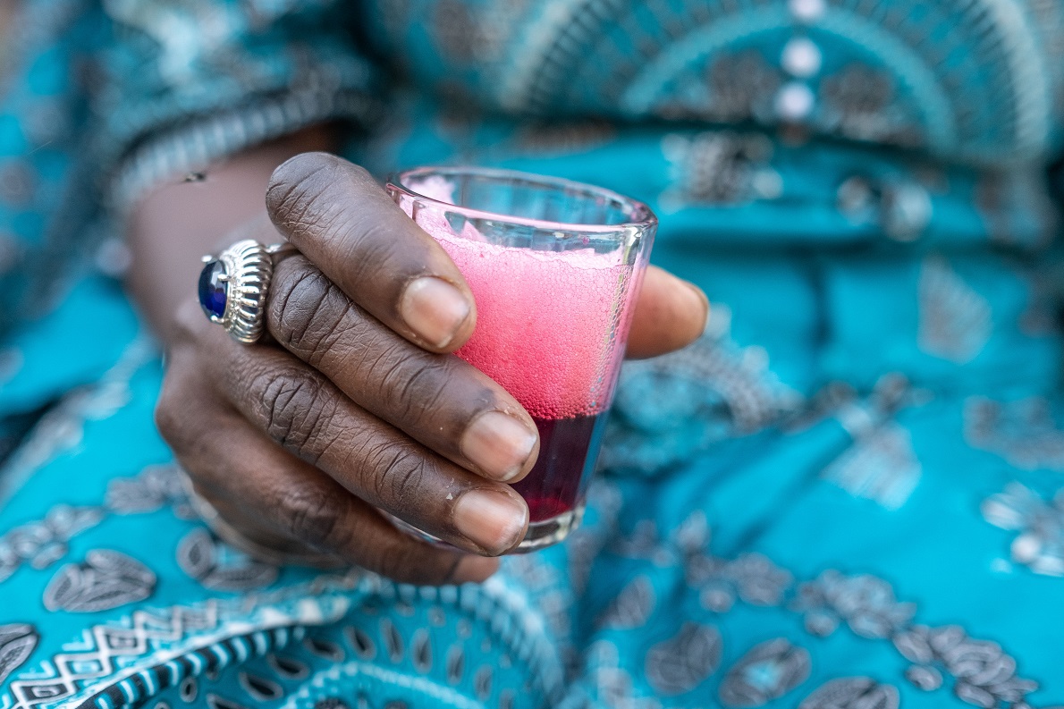 È rosso, ha un sapore lievemente aspro, ma è dissetante e rinfrescante come poche altre bevande. Il carcadè è uno degli infusi più diffusi nell’Africa occidentale. Anche se, è bene ricordarlo, le sue origini sono in Africa orientale. - Foto di Tommy Trenchard/Panos Pictures;