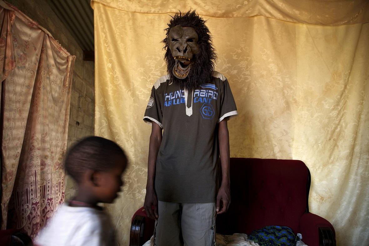 Werner Jelkson, Boscimano residente a Schmidtsdrift, indossa una maschera da gorilla. Vaga spesso per le strade mascherato, spaventando i bambini e intrattenendo i vicini. – Foto di James Oatway
