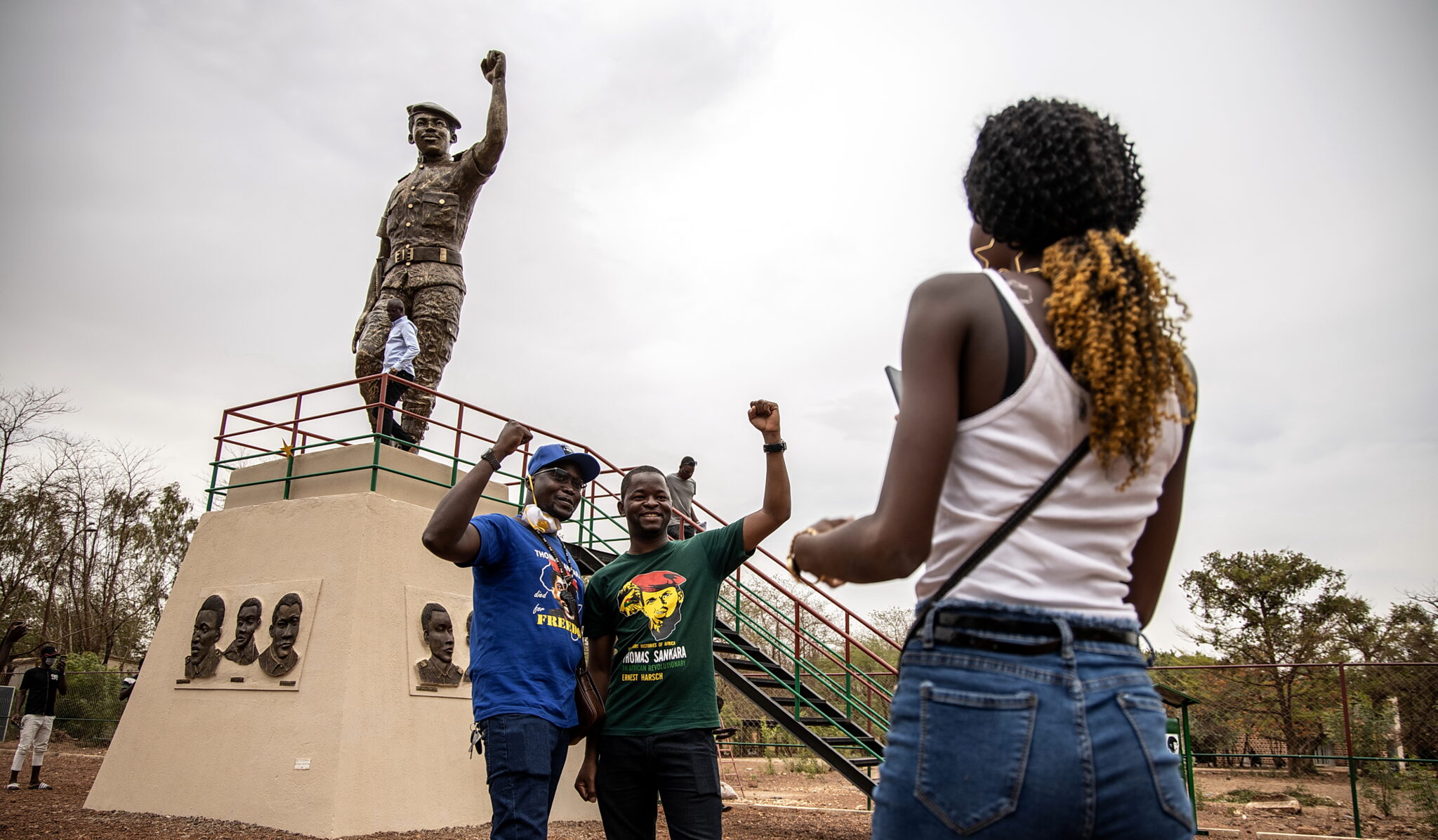 Giovani in posa per una foto davanti alla statua di bronzo di Thomas Sankara inaugurata poche settimane fa al memoriale di Ouagadougou. – Foto di Olympia De Maismont