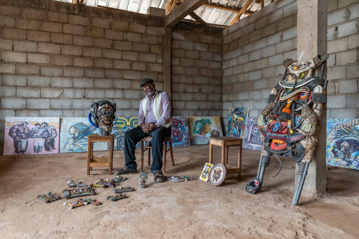 Joseph-Francis Sumégné circondato da alcune sue sculture realizzate con pezzi meccanici di recupero. È uno degli artisti camerunesi più famosi nel mondo. – Foto di Alessio Perboni