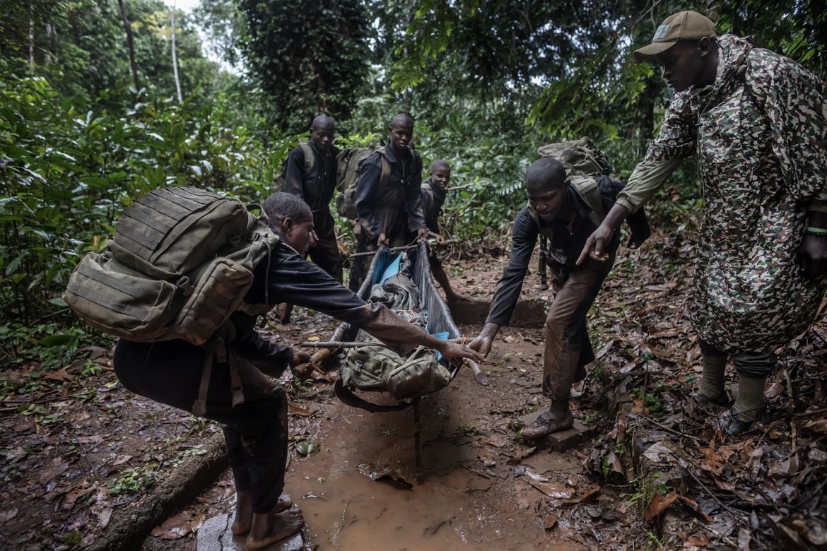 Esercitazione di soccorso in foresta: trasporto di un ferito nel fango dopo la pioggia, come in una vera missione. – Foto di Luca Catalano Gonzaga