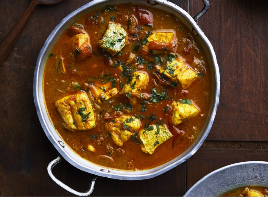 Tagliate il pesce a pezzi medi e conditelo con succo di limone, sale e pepe. Lasciatelo marinare per circa 15 minuti. In una padella, soffriggete cipolla tritata, aglio e curry con un filo d’olio. Unite i pomodori tagliati a cubetti e lasciate cuocere per 5 minuti. Versate il latte di cocco, portate a bollore, quindi aggiungete il pesce. Coprite e lasciate cuocere per 15 minuti. Servite caldo, accompagnato da riso bianco o chapati.