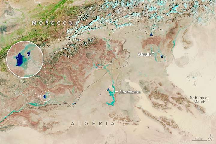 Vaste regioni desertiche al confine tra Algeria, Libia e Tunisia sono interessate da settimane da anomale precipitazioni record. Le immagini satellitari dell’agenzia Nasa ci restituiscono un cambiamento molto evidente dal colore giallo al verde in alcune parti del deserto del Sahara, nonostante la regione sia nota per essere una delle più secche della Terra.