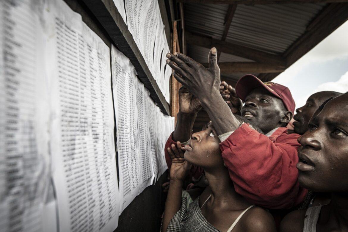 Nel campo di Kanyarutshinya sfollati cercano il proprio nome negli elenchi dei destinatari di aiuti alimentari programmati dalle organizzazioni umanitarie. – Foto di di Simon Townsley / Panos Pictures