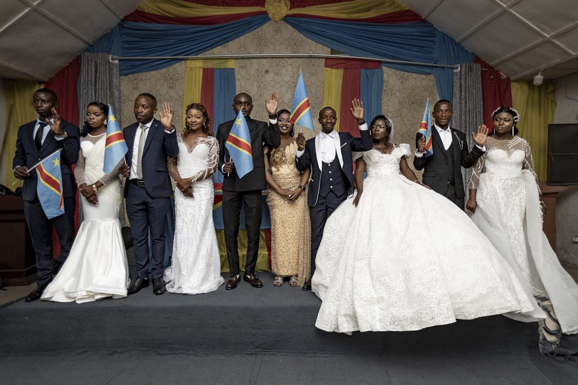 Coppie di novelli sposi si uniscono in matrimonio al municipio di Goma durante le celebrazioni di San Valentino. L’occupazione ribelle e l’instabilità non fermano il desiderio di normalità. – Foto di Michel Lunanga/Afp