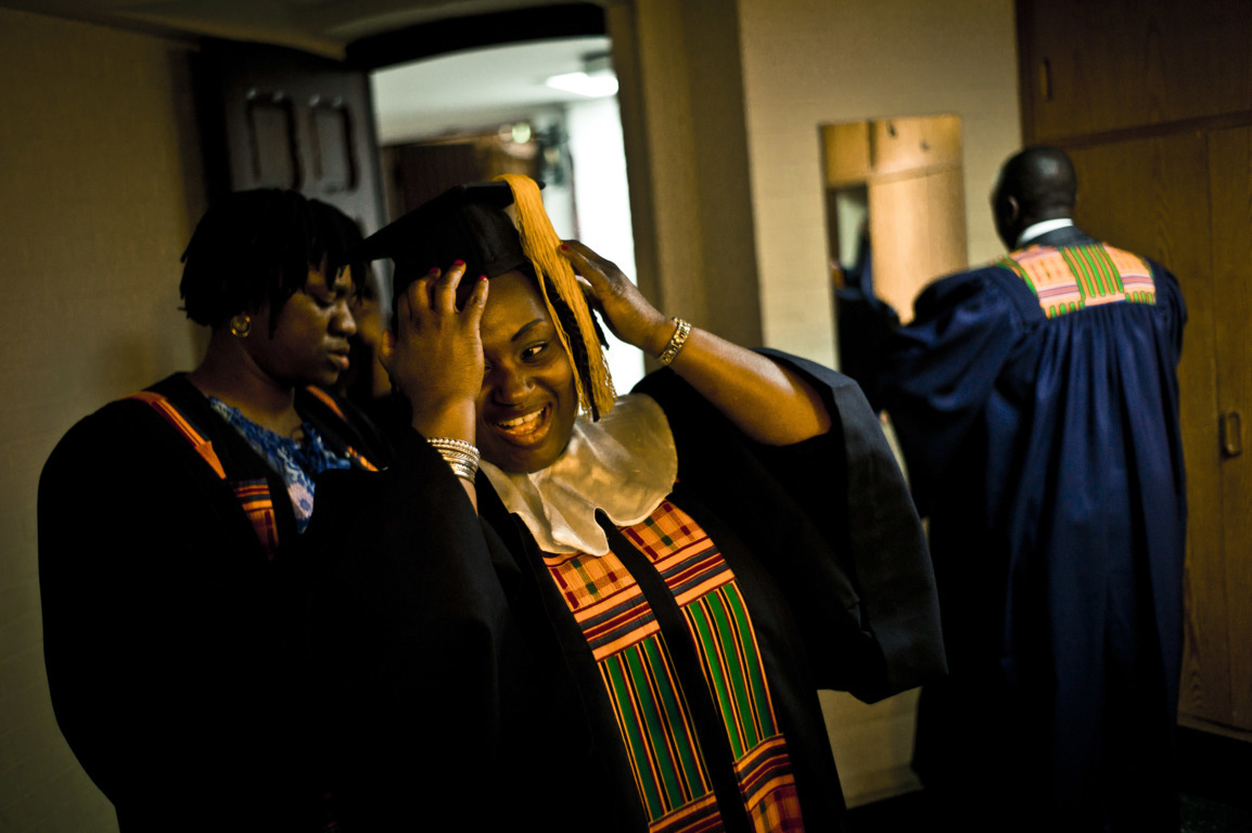 Una corista di una chiesa cristiana in Svizzera si prepara per la messa domenicale. La sciarpa di kente è un tratto distintivo della comunità di immigrati ghanesi. – Foto di Christian Irrgang