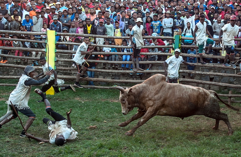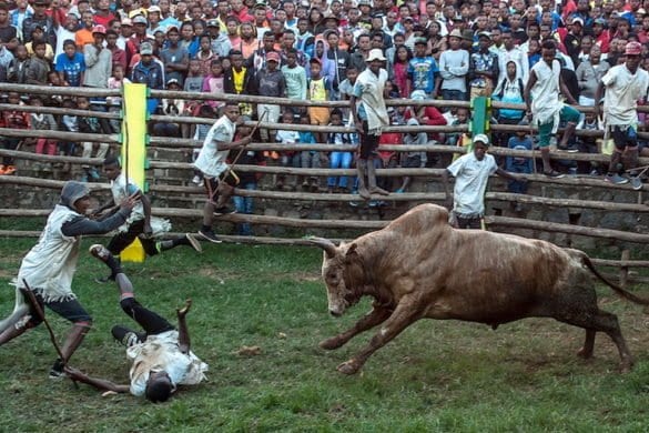 È una via di mezzo fra il rodeo americano e la tauromachia spagnola, ma a differenza di quest’ultima non prevede l’uccisione né il ferimento degli animali. Perché lo zebù è sacro e celebra il coraggio dei giovani betsileo.