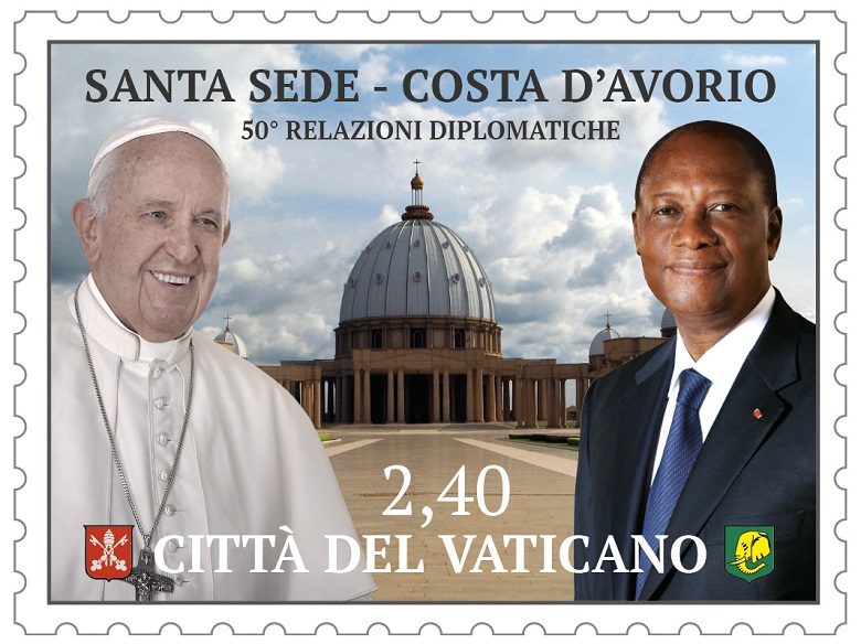 Osservando il francobollo chiamato a festeggiare il mezzo secolo dei rapporti diplomatici tra Santa Sede e Costa D’Avorio verrebbe da pensare che in Vaticano sia stata adottata la lingua francese, come suggerirebbe la scritta “Cité du Vaticano”, e come valuta il franco CFA.