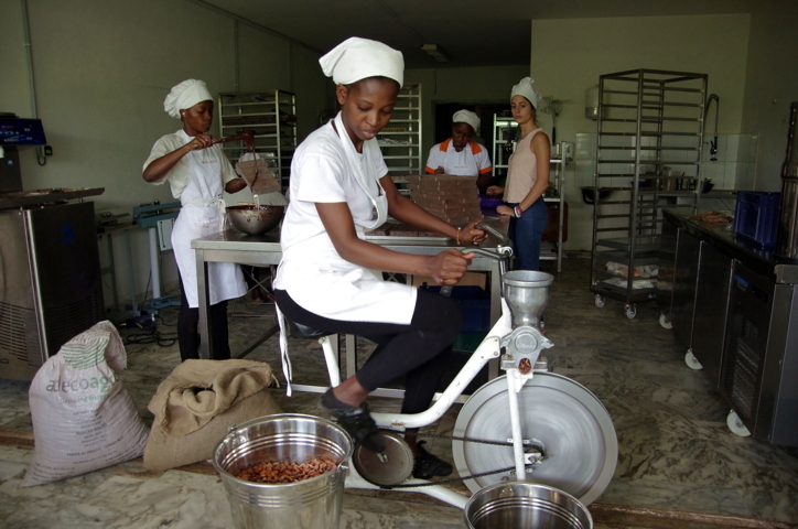 Costa d’Avorio, Abidjan. Una delle artigiane di Mon Choco, piccola fabbrica di cioccolato ivoriana, sulla macina-cyclette che sminuzza le fave di cacao sfruttando l’energia della pedalata.