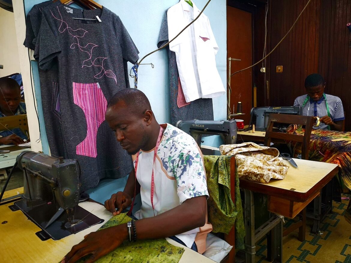 Sarti al lavoro su antiche macchine da cucire nel laboratorio dove si realizzano i capi del celebre principe della moda di Abidjan, Pathé’O – Foto di Céline Camoin