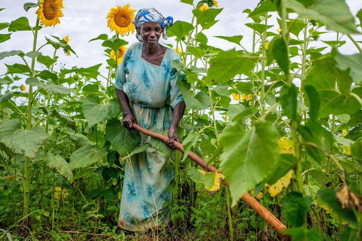 Donna ugandese nel suo campo di girasoli, coltura di recente introduzione all’Equatore, diventata la principale fonte di reddito di molte famiglie contadine, – Foto di Sumy Sadurini/ Fao/ Afp