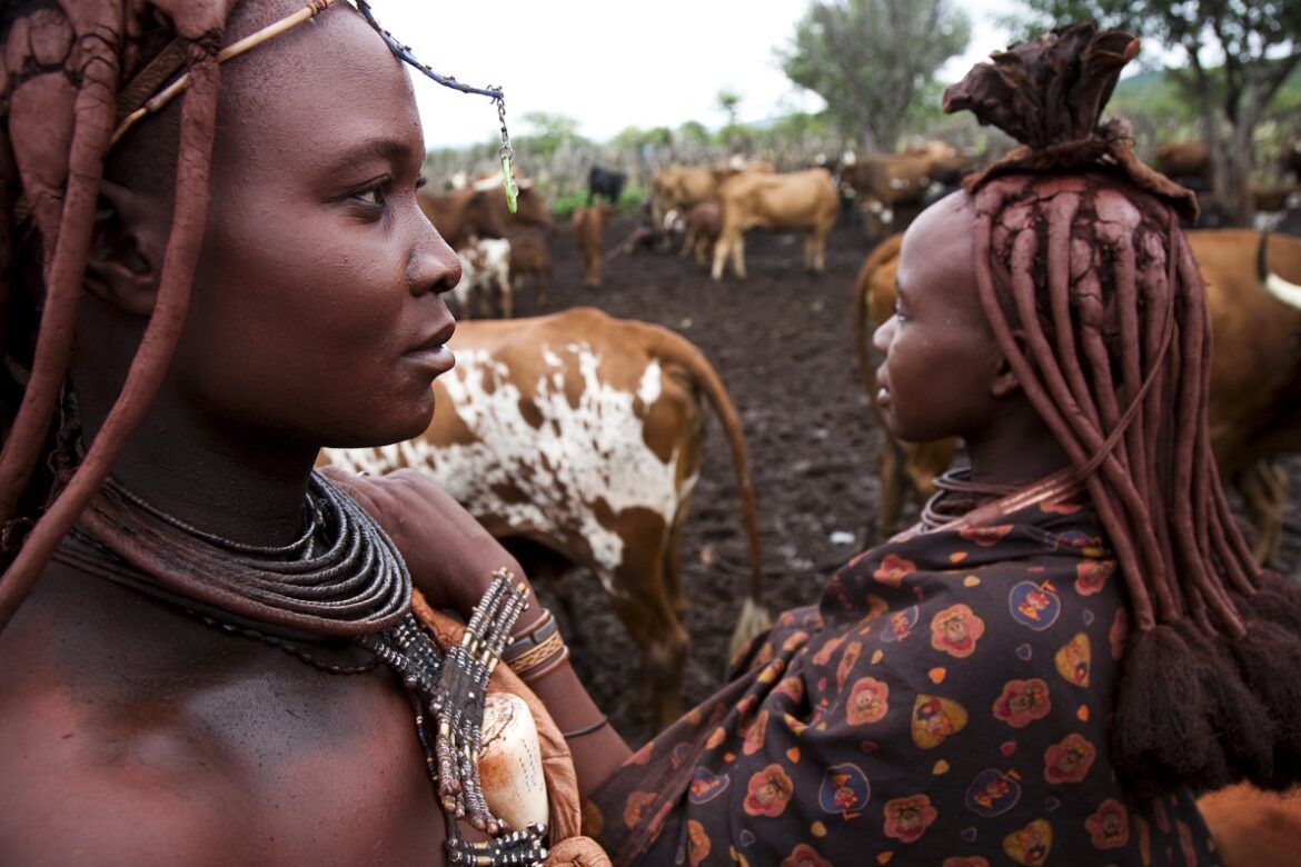 Donne himba, con la tipica acconciatura. Questo popolo di pastori vive al confine tra Namibia e Angola – Foto di Peter Menzel