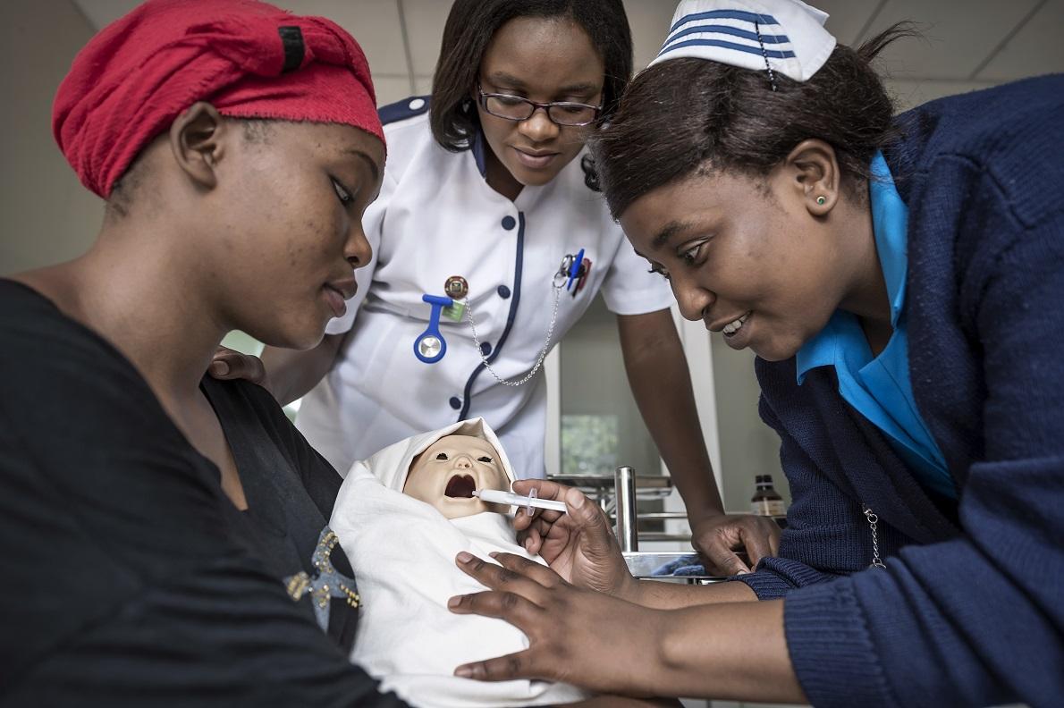 Due studentesse infermiere simulano la somministrazione di una medicina a un neonato. – Foto di Sven Torfinn