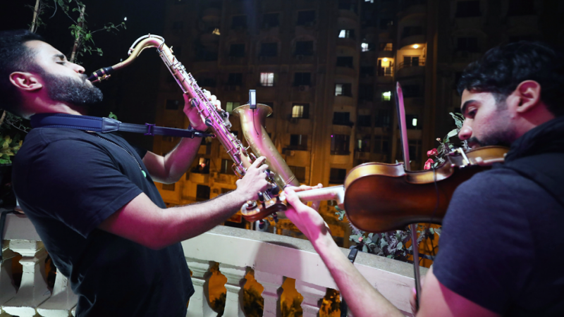 Il violinista egiziano Mohamed Adel e un sassofonista hanno offerto uno spettacolo unico a Giza offrendo ai loro vicini un concerto gratuito nel tentativo di rallegrare i vicini durante il coprifuoco notturno imposto dall’epidemia di coronavirus.