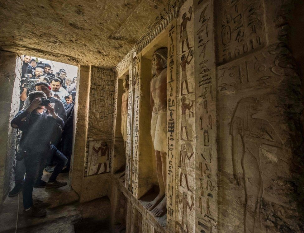 Il sepolcro che “si è conservato eccezionalmente bene ed è adorno di affreschi colorati e diverse sculture” è stato rinvenuto da un’equipe di archeologi egiziani a Saqqara, non molto lontano dal Cairo. Il ministro,come riportato da JeuneAfrique, ha rivelato di fronte alla stampa che si tratterebbe della “tomba di un sacerdote di alto rango” come dimostrano “le scene scolpite e dipinte sulle pareti in cui si vede il defunto in compagnia di sua madre, di sua moglie e della sua famiglia”. Nelle stanze del sepolcro sono state ritrovate 18 nicchie e 24 statue colorate.