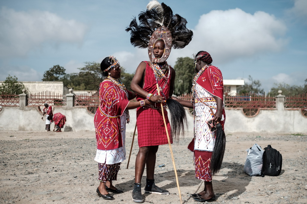 Preparativi in vista di una esibizione di danze masai in occasione della “Maratona per la pace e la coesione sociale” organizzata dalla contea di Kajiado, in Kenya. Foto tratta dal servizio “Se questo è un Masai” – metamorfosi e resilienza di un popolo fiero e nobile, con testo dell’antropologo Alberto Salza, pubblicato sul nuovo numero della Rivista Africa.