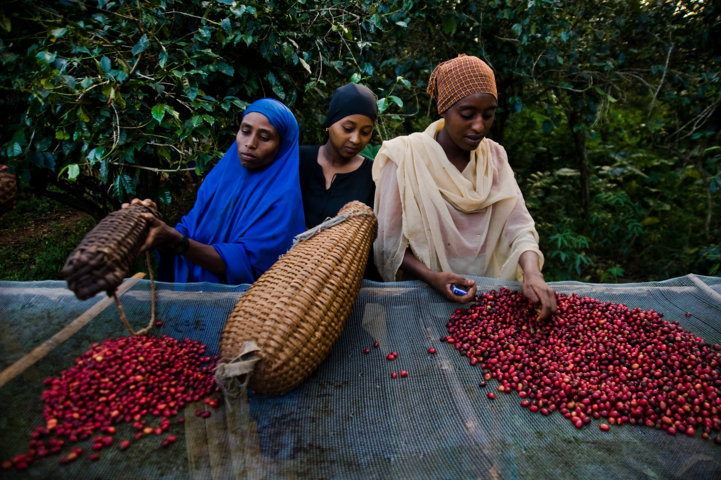 Dopo la raccolta, le ciliegie del caffè vengono essiccate al sole su reti sospese. Nei remoti boschi di Harenna, in Etiopia, a quasi duemila metri di altitudine, prosperano frutti spontanei di qualità superba che i raccoglitori locali prelevano a mano e trasportano a dorso d’asino lungo sentieri tortuosi, fino alla capitale.