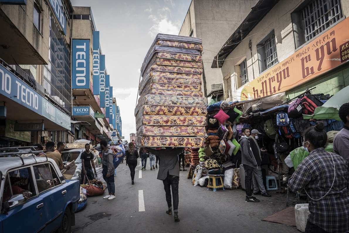 Etiopia: commerciante trasporta sulla testa una pila di materassi per una via di Merkato, altro storico quartiere di origine coloniale, sede di vecchie botteghe e di imprese famigliari, minacciato dalle ruspe. – Foto di Amanuel Sileshi