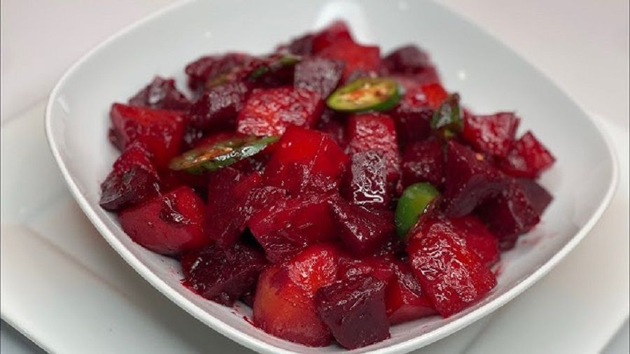 In una padella capiente, aggiungere l’olio vegetale e la cipolla tritata e fatela soffriggere. A questo punto aggiungete lo zenzero, l’aglio, ½ cucchiaino di sale e la senape e mescolare bene. Una volta che questo composto sarà diventato profumato, aggiungete le patate cotte e le barbabietole, mescolando il tutto. Trasferire in una ciotola separata il composto di patate e barbabietole e aggiustate di sale. Servite l’insalata fredda come da tradizione o tiepida.