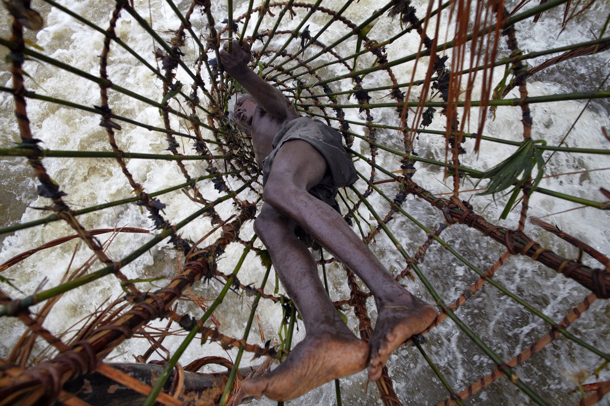 Un pescatore si cala nell’acqua con la sua cesta per catturare i pesci sospinti dalla corrente. – Foto di i Andrew McConnell / Panos