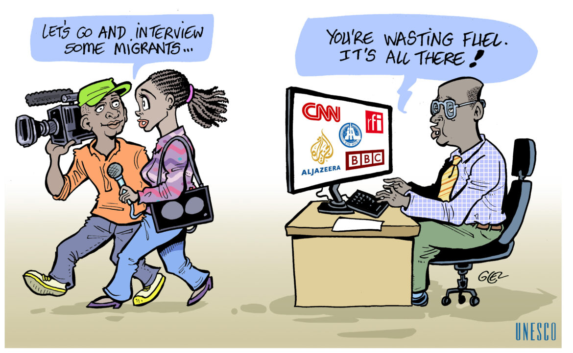 L’informazione è dunque fondamentale. “Uno degli obiettivi – sostiene Michel Kenmoe, consigliere regionale per la comunicazione e l’informazione presso l’ufficio dell’Unesco a Dakar  – è proprio quello di rafforzare la capacità degli operatori dell’informazione, dei giornalisti africani all’interno della regione dell’Africa dell’Ovest, per una migliore copertura dell’informazione sulla migrazione, sia tra i paesi dell’Africa dell’Ovest e centrale, che verso l’Europa, consentendo ai giovani della sottoregione di accedere ad un’informazione di qualità su questa complessa tematica. Occorre sondare il fenomeno, comprenderlo, vederlo nelle sue diverse sfaccettare per poter fare un’informazione corretta”. Spesso capita, per esempio, che un giovane che ha mille euro con i quali può aprire un piccolo negozietto, viene spinto dalla famiglia a spenderli per intraprendere il viaggio della speranza attraverso il Mediterraneo, anziché a mettersi in gioco dove vive.  Tra i protagonisti di questa campagna – che ha visto la diffusione in francese, inglese e lingue nazionali di messaggi audio, visuals, vignette e clip video – c’è il noto vignettista franco-burkinabé, Damien Glez, che attraverso un cartoon – in questo caso in inglese, francese e Yoruba – illustra le difficoltà per i media africani a produrre un’informazione indipendente sulla tematica migratoria. I messaggi, poi, sono stati tradotti in 20 lingue nazionali: Beti (Camerun); Agni, Bété, Guéré, Baoulé (Costa d’Avorio); Fanti, Asante (Ghana); Soussou, Malinké (Guinea-Conakry); Bambara, Peul, Songhay (Mali); Haoussa, Djerma (Niger); Igbo, Yoruba et Pidgin (Nigeria); Mandingo, Serer et Wolof (Senegal).