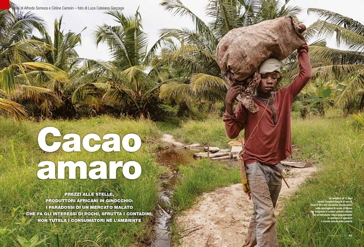 Un bambino di 12 anni mentre trasporta sacchi di cacao. Circa il 30% dei minorenni che lavorano nelle piantagioni di cacao in Ghana non frequenta la scuola: privare i minori di un’istruzione riduce notevolmente le speranze di spezzare il circolo vizioso della povertà. – Copertina del servizio pubblicato sul numero di luglio-agosto della rivista Africa “Cacao amaro” a firma di Alfredo Somoza e Céline Camoin. Foto di Luca Catalano Gonzaga