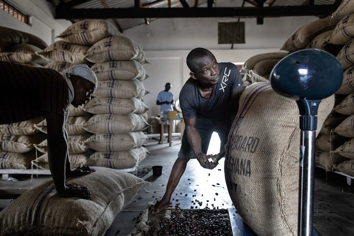 Controllo di qualità delle fave di cacao in un magazzino della regione di Kumasi, in Ghana. I coltivatori raccolgono circa 350 kg di cacao al mese per sei mesi di lavoro, per un guadagno equivalente a 2.000 dollari. – Foto di Luca Catalano Gonzaga