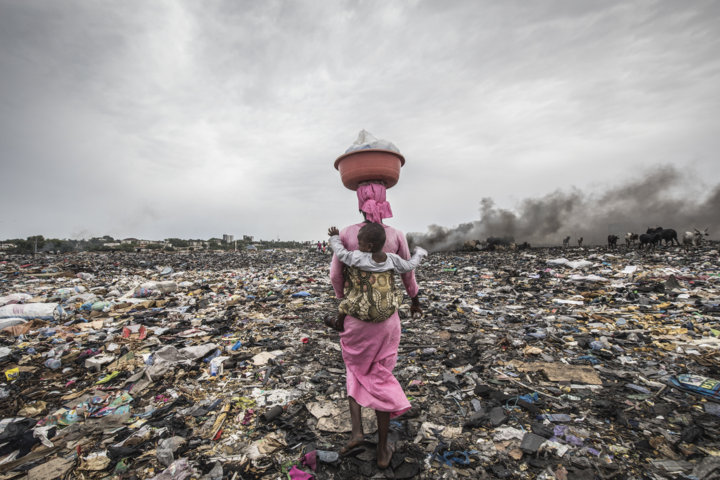 Un’elegante signora porta il pranzo ai bruciatori che lavorano nella discarica di Agbogbloshie (Ghana), una delle più enormi discariche al mondo di rifiuti elettrici ed elettronici che è un inferno per chi ci lavora e ci vive accanto. Ora il governo di Accra vuole bloccare l’importazione di elettrodomestici dannosi.