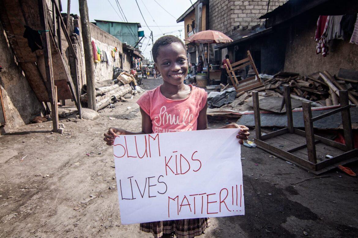 Una bambina sorridente mostra con orgoglio un cartellone con una grande scritta: “SLUM KIDS LIVES MATTER”, altri sorreggono bene in vista fogli colorati che ricordano come l’educazione di qualità o un ambiente sicuro siano un diritto fondamentale.