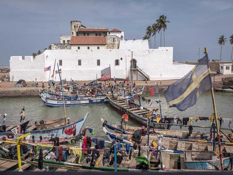 Il vivace porto di Elmina, dominato dalla fortezza, edificata dai portoghesi nel 1482, considerata il più antico edificio coloniale dell’Africa subsahariana. – Foto di Sven Torfinn