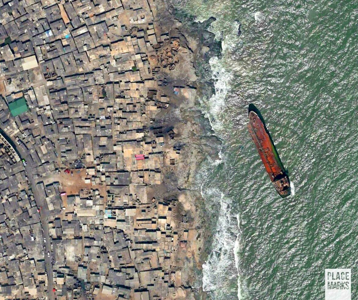 Alla periferia di Accra il relitto di una petroliera di oltre 80 metri giace da anni in balia delle onde a pochi metri dalle case stipate lungo la costa.