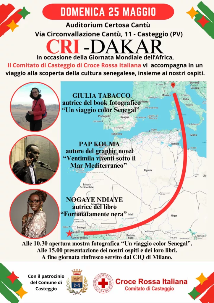 Domenica 25 maggio celebrate la Giornata Mondiale dell’Africa con “CRI – DAKAR” all’Auditorium Certosa Cantù di Casteggio (PV). Un viaggio simbolico dall’Italia al Senegal, tra parole, immagini e sapori, per promuovere cultura e inclusione. Mostra fotografica, incontri con autori, musica, libri e abiti tradizionali. Dalle 17:15, rinfresco con piatti senegalesi realizzati dal CIQ – Centro Internazionale di Quartiere di Milano.