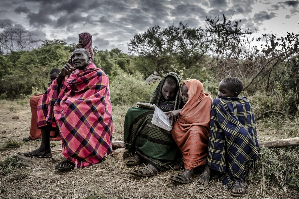 Giovani pastori leggono un libro di scuola in un villaggio del Karamoja. – Foto di Luis Tato