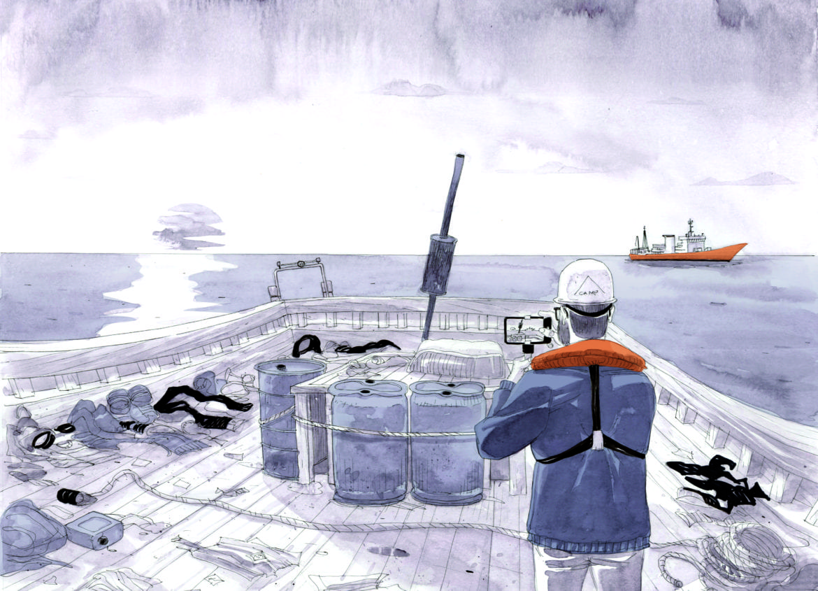 1) Tre settimane. È questo il tempo che il giornalista Marco Rizzo e il disegnatore Lelio Bonaccorso hanno trascorso nel novembre 2017 sulla Aquarius, la nave bianca e arancione con cui gli operatori di Sos Méditerranée< e Medici senza frontiere< hanno effettuato operazioni di soccorso di migranti al largo della Libia. Prende dunque vita sul campo Salvezza (Feltrinelli Comics), opera di graphic journalism, che all’inizio ci racconta la quotidianità della vita a bordo, facendo conoscere le persone imbarcate e le loro storie, e rendendoci man mano sempre più partecipi delle operazioni di salvataggio nel cuore del Mediterraneo. Rizzo e Bonaccorso vivono e documentano in prima persona la missione (entrambi appaiono nelle belle tavole ad acquerello), il lavoro di chi soccorre coloro che, per disperazione, affrontano il mare su gommoni fatiscenti. E col passar dei giorni emergono le vite, le persone, le singole storie di chi è fuggito, uomini, donne e bambini salvati e accolti a bordo. Testimonianze drammatiche, richieste di aiuto, momenti di tenerezza, di confidenze, lacrime e sorrisi; e anche informazioni utili a comprendere il quadro della situazione, con dati sui flussi migratori e sui contesti dei paesi attraversati dai profughi.