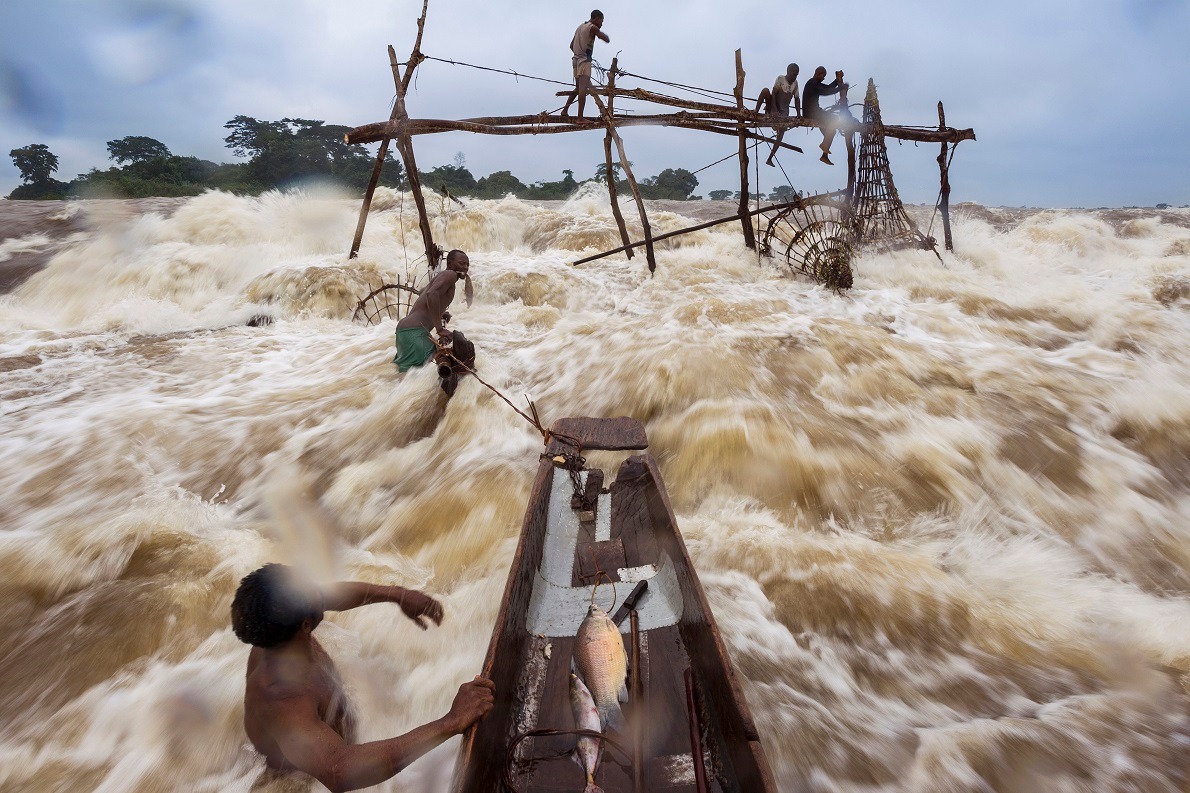 I Wagenia raggiungono con le loro piroghe i ponteggi in legno costruiti nel bel mezzo del fiume, sfidando la forza tumultuosa della rapide. – Foto di Andrew McConnell / Panos