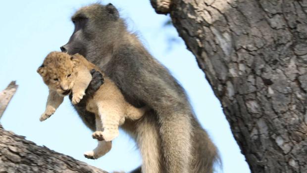 Contesto di questa surreale scena è il Kruger National Park, in Sudafrica, dove una guida che vi lavora da venti anni, Kurt Schultz, un paio di settimane fa è riuscita a immortalare in un video il momento in cui un babbuino maschio agguanta un cucciolo di leone e se lo porta su un albero. Una volta posizionato sul ramo inizia a spulciarlo come se fosse un suo simile, per poi stringerlo come un pupazzo.