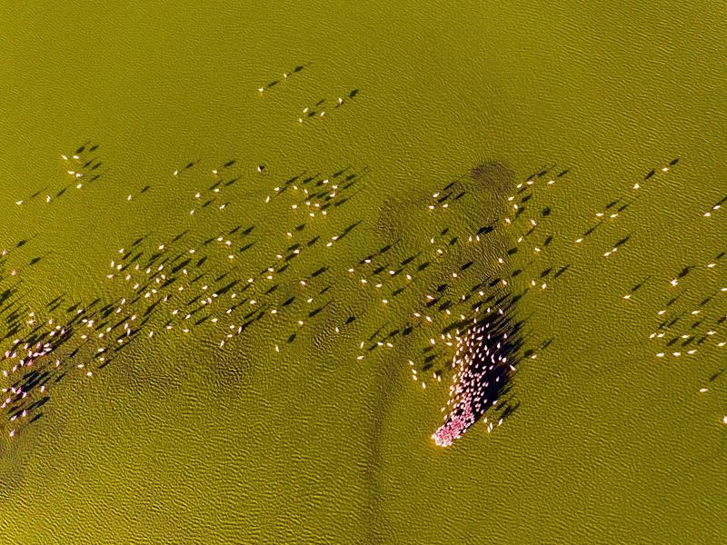 Fenicotteri sul Lago Magadi. Le acque saline sono ricche di cianobatteri (come le alghe Spirulina platensis) e piccoli crostacei, (quali l’artemia salina), di cui gli uccelli vanno ghiotti. Sono alimenti ricchi di