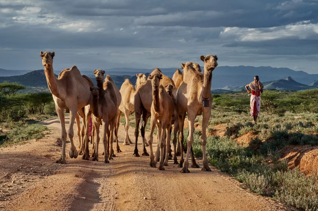 A essere colpiti in modo drammatico sono stati soprattutto i bovini. I racconti dei pastori si somigliano tutti: chi aveva 100 o 150 mucche si è ritrovato con una manciata di animali da un giorno all’altro. Persone un tempo benestanti si sono viste costrette a lottare per nutrire le proprie famiglie. Alcuni hanno lasciato i pascoli e, con i risparmi rimasti, hanno comprato una moto o un’auto per dedicarsi alle consegne o al trasporto passeggeri. In questi anni aridi, sono stati i camelidi a sopportare meglio la mancanza d’acqua e le temperature torride. Una conferma delle previsioni delle autorità keniane, che da tempo indicavano l’allevamento del cammello africano come possibile risposta al riscaldamento globale. Nel 2013, con l’obiettivo di rafforzare la sicurezza alimentare il governo ha avviato un programma per distribuire cammelli alle comunità delle aree più aride del Paese, come la Contea di Samburu, importandoli dai Paesi vicini. I pastori stessi hanno iniziato a scambiare mucche con dromedari, oppure ad acquistarli, anche se il prezzo è più elevato: dai 600 agli 800 dollari per un maschio, fino a 1.200 per una femmina, contro i 150-300 di una mucca. Nonostante il costo, molti allevatori del Kenya settentrionale hanno scelto questa transizione: oggi allevano dromedari, più resistenti di capre, pecore e bovini. Anche solo due esemplari possono garantire il sostentamento di una famiglia.