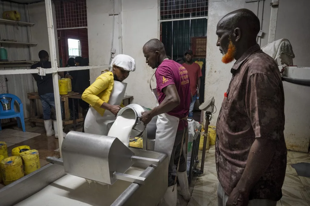 La femmina del cammello africano produce latte – fino a 20 litri al giorno, a seconda della stagione, della dieta e delle condizioni ambientali –, un “oro bianco” di cui il Kenya è il principale produttore mondiale, con circa 1,165 milioni di tonnellate annue. Buoni numeri, anche se ancora bassi rispetto a quelli dei bovini, che possono fornire dai 25 ai 28 litri giornalieri. Il latte di cammella è però apprezzato per le sue proprietà nutrizionali e terapeutiche, essendo ricco di vitamina C oltre che di proteine e grassi, e adatto a persone con intolleranza al lattosio perché ne contiene in quantità minore. Con il suo colore bianco intenso e un sapore leggermente salato, è molto richiesto a Nairobi, specialmente tra le comunità somale, e viene venduto a un prezzo superiore rispetto al latte vaccino.Nei bar della capitale si serve, per esempio, il camelcino, un cappuccino con latte di cammello. Se ne ricavano anche yogurt e altri prodotti caseari. Artefici di questa produzione sono soprattutto cooperative e lavoratori e lavoratrici informali.