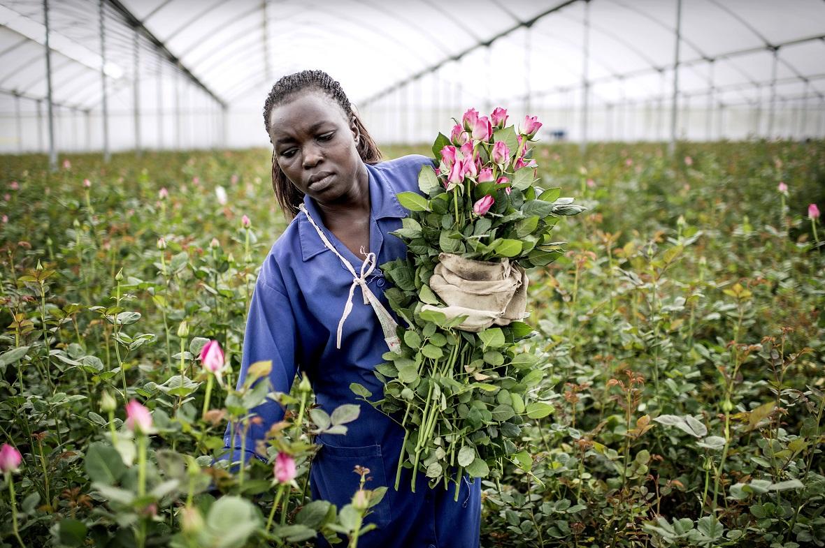 Una lavoratrice raccoglie le rose presso l’azienda agricola di fiori Maridadi. – Foto di Sven Torfinn